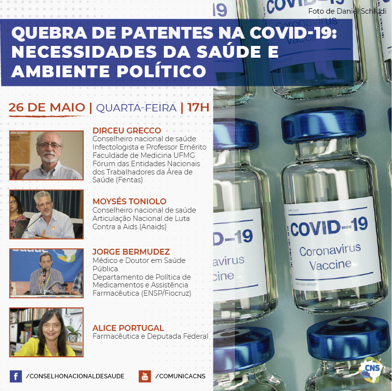Esta é a segunda live realizada pelo CNS sobre o assunto. Serão discutidos os riscos e benefícios da quebra de patentes para o Brasil. Os participantes irão avaliar a implementação de licença compulsória para toda a tecnologia necessária para atender a população no combate à Covid-19, considerando os aspectos políticos nacionais brasileiros.