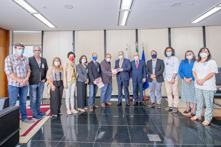 A Mesa Diretora do Conselho Nacional de Saúde (CNS) e representantes de entidades e do Conselho Nacional de Direitos Humanos (CNDH) estiveram nesta quinta (19/11) na Procuradoria Geral da República (PGR), em Brasília, onde entregaram o documento “Denúncia de Violações dos Direitos à Vida e à Saúde no contexto da pandemia da covid-19 no Brasil” para o procurador-geral Augusto Aras.