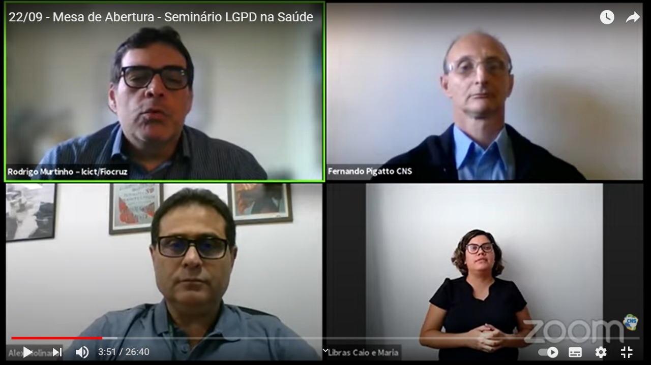 A mesa foi composta também por Rodrigo Murtinho, do Instituto de Comunicação e Informação Científica e Tecnológica em Saúde da Fiocruz (ICICT) e pelo presidente do CNS, Fernando Pigatto, que disparou, sobre os ataques que o órgão tem recebido: “cada ataque que a gente sofre é mais motivo para seguirmos avançando, porque se a gente incomoda alguns, que se acham donos da verdade, e que acham que podem impor para nós inclusive restrições, impedimentos e ameaças, nós levantamos a cabeça e proclamamos o Estado Democrático de Direito”. Já o diretor do ICICT/Fiocruz, Rodrigo Murtinho, alertou que o uso de dados sensíveis pode gerar diversos tipos de discriminação e afirmou que a proteção de dados é um direito fundamental para o exercício da cidadania no mundo de hoje.