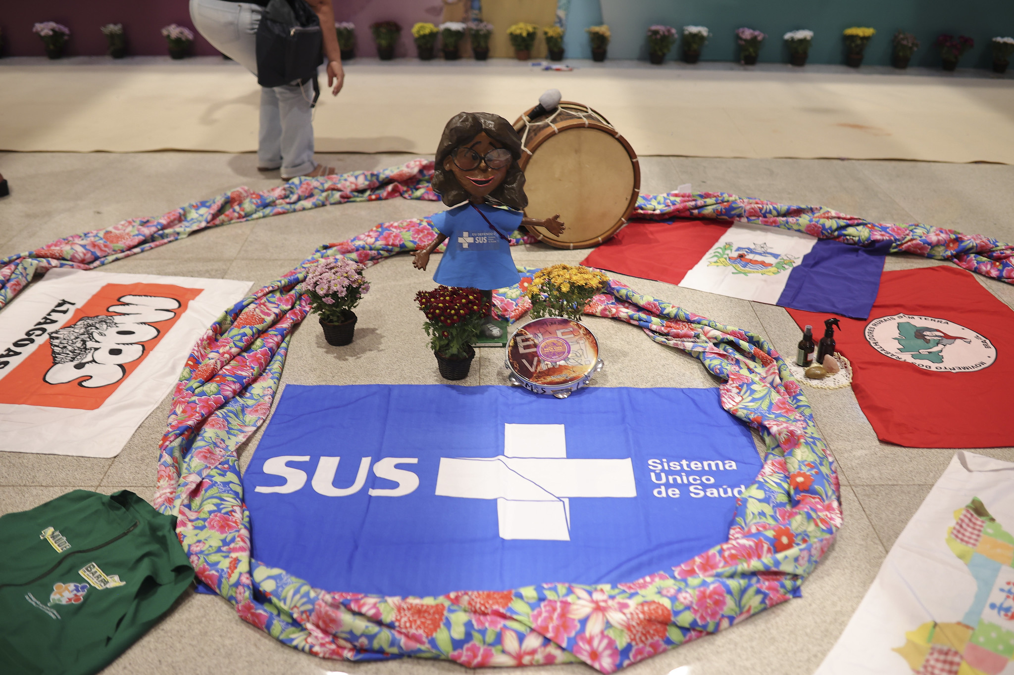 Descrição da imagem: Bandeira do SUS no chão, ao redor tecido em chita e bandeiras diversas.