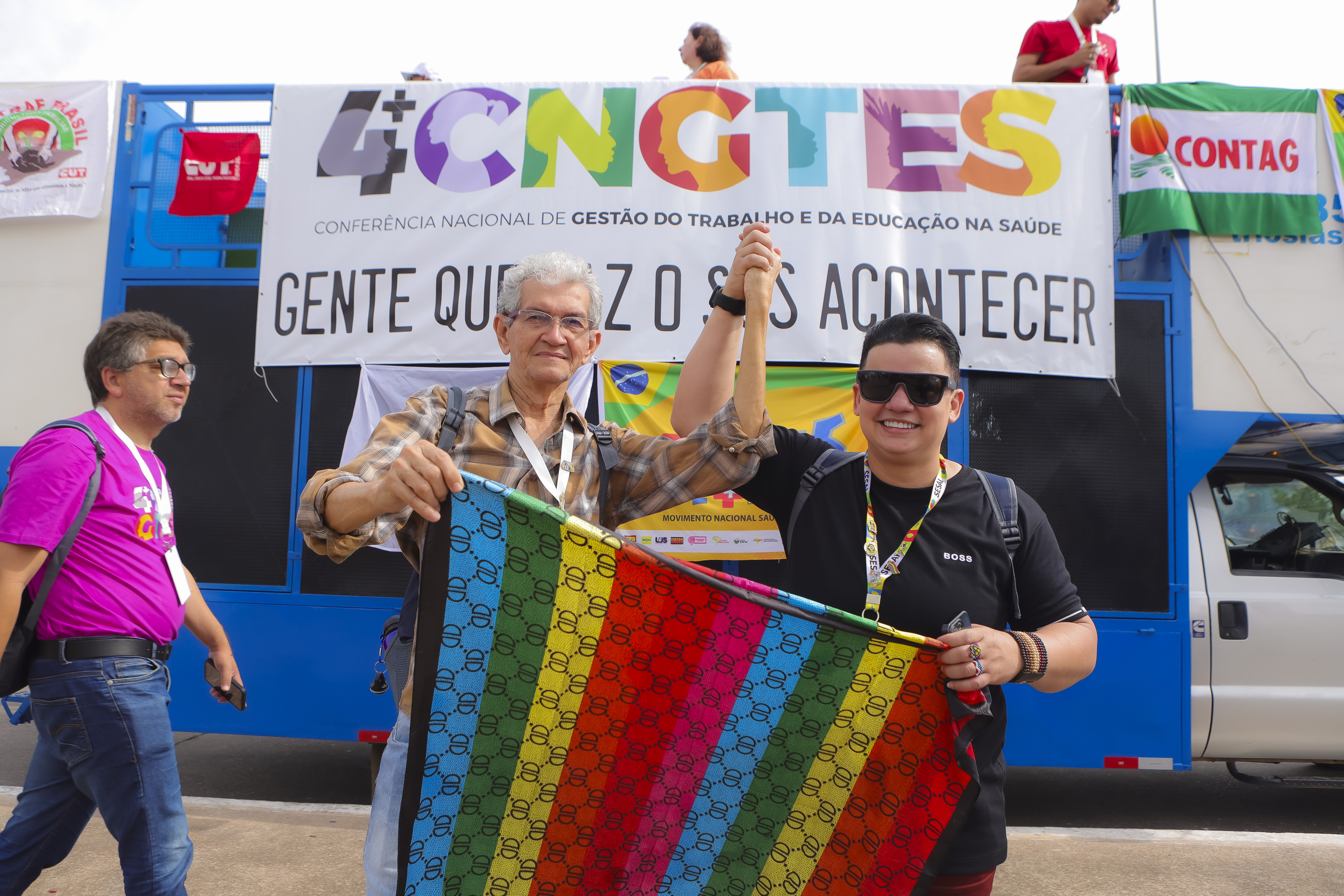 Descrição da imagem: Duas pessoas com mãos dadas levantadas para o alto, segurando uma bandeira colorida. Ao fundo, o carro de som do evento com grande banner da logomarca da conferencia.