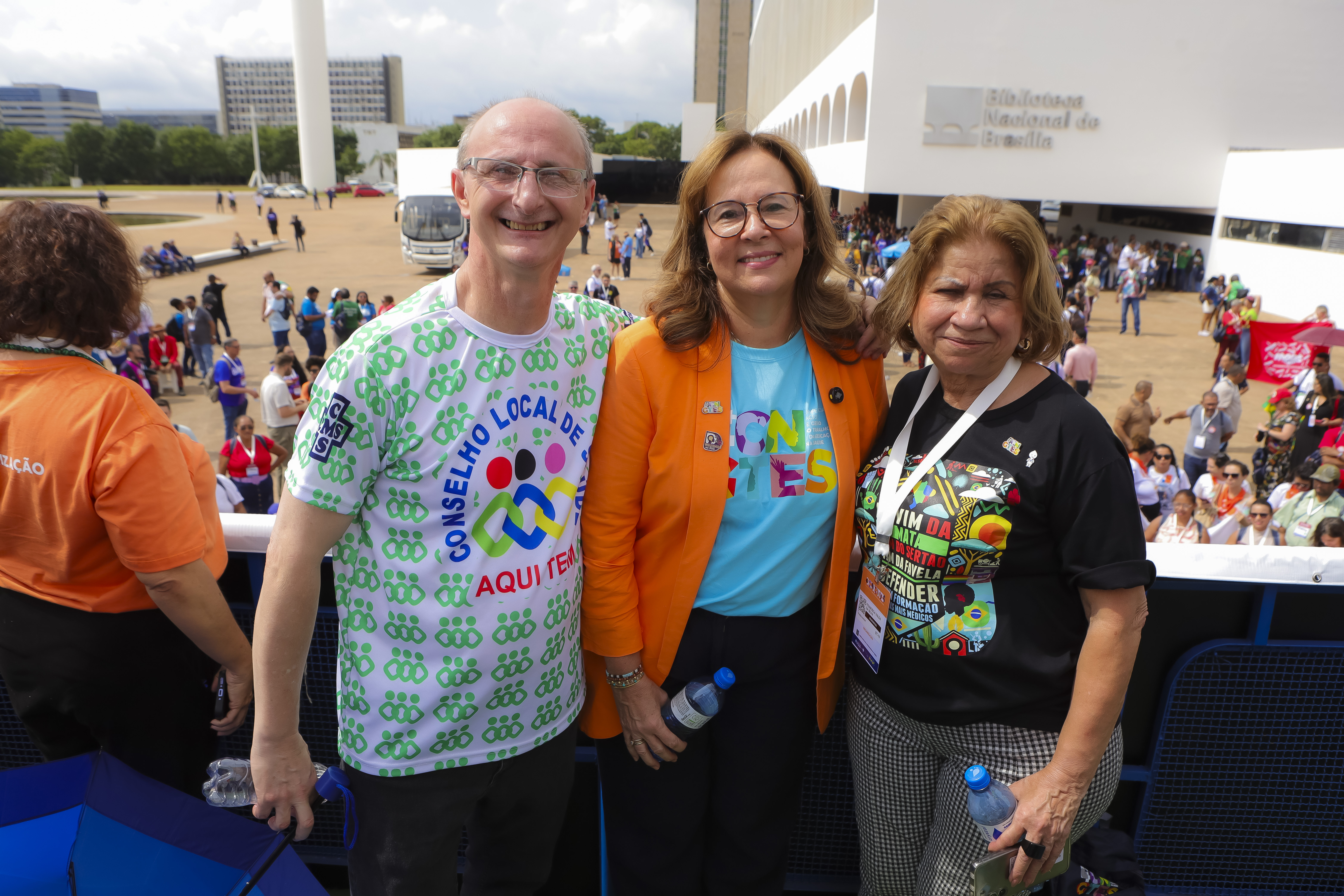 Descrição da imagem: Pigatto, Isabela e Franscisca Valda abraçados em cima do carro de som, no centro da foto. Ao fundo, público do ato.