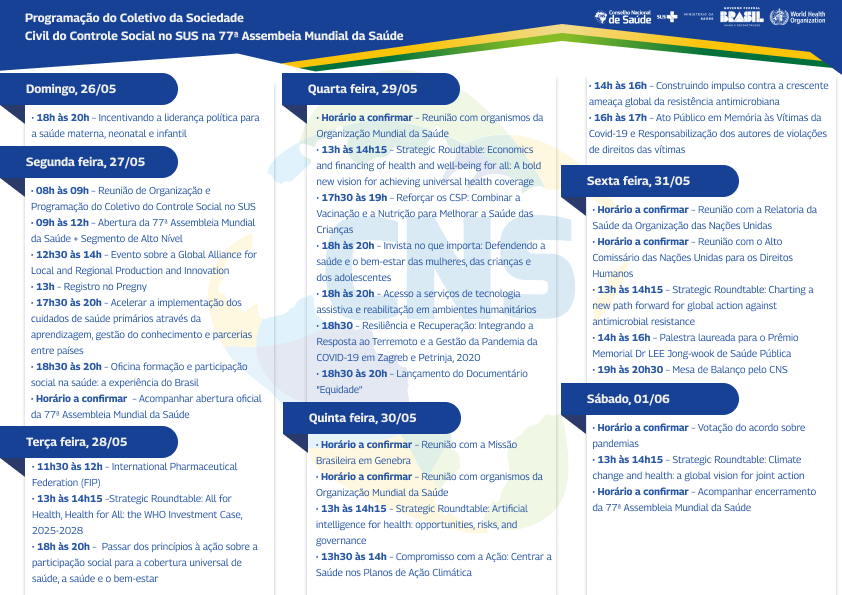 O Conselho Nacional de Saúde (CNS) vai participar da 77ª Assembleia Mundial da Saúde, que será realizada de 27 de maio a 2 de junho, em Genebra, na Suíça. Essa é a primeira vez que no evento internacional será votada uma resolução sobre participação social aos Estados-Membros, o que poderá tornar o Controle Social do SUS uma referência mundial, que será apresentada pelo Brasil e outros países.