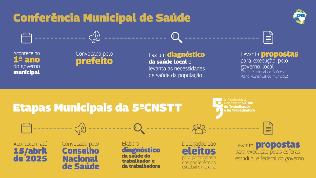 É importante atentar que as conferências têm processos e objetivos diferentes, apesar de ambas acontecerem a partir do início de 2025. A 5ª CNSTT é organizada pelo CNS e Ministério da Saúde, e tem calendário próprio de etapas. Já as conferências municipais de saúde tem calendário definido pelo executivo local, tendo que ser obrigatoriamente realizada no primeiro ano da gestão. Confira a orientação do Conselho Municipal de Secretarias Municipais de Saúde (Conasems).