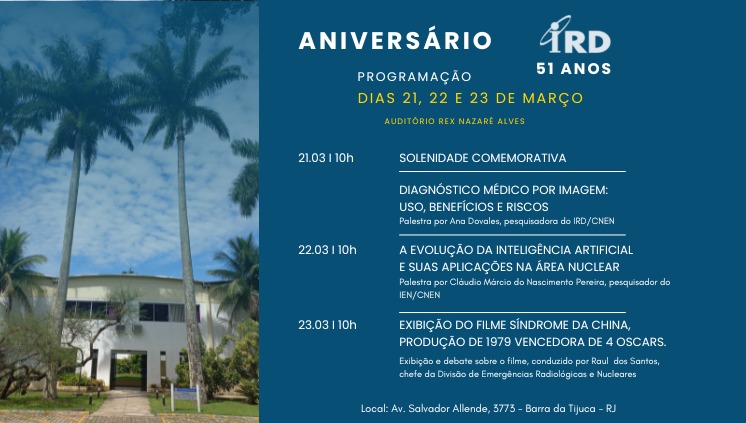 No dia 23/03, quinta-feira, a exibição do filme Síndrome da China, produção de 1979 ganhadora de quatro Oscars que retrata um acontecimento irregular em uma usina nuclear e uma investigação em busca dos fatos. Uma introdução ao filme e uma discussão após a exibição será conduzida por Raul dos Santos, chefe da Divisão de Atendimento a Emergências Radiológicas e Nucleares do IRD. O filme é anterior ao acidente nuclear de Three Miles Island, nos Estados Unidos.