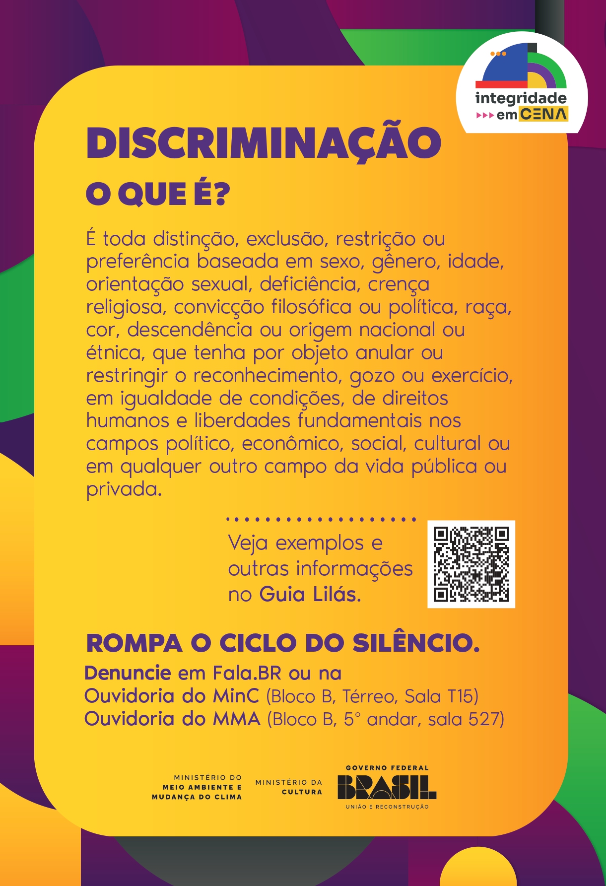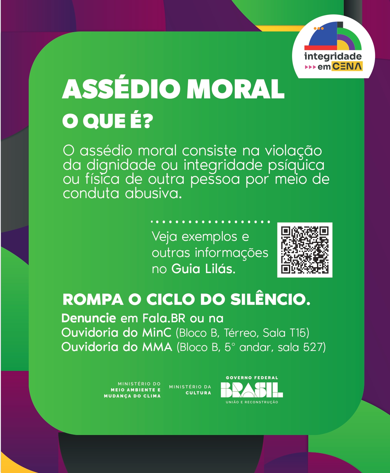 A campanha "Assédio e Discriminação: Rompa o Ciclo de Silêncio", é uma ação conjunta e contínua de combate a tais práticas no Ministério da Cultura (MinC) e no Ministério do Meio Ambiente e Mudança do Clima (MMA).