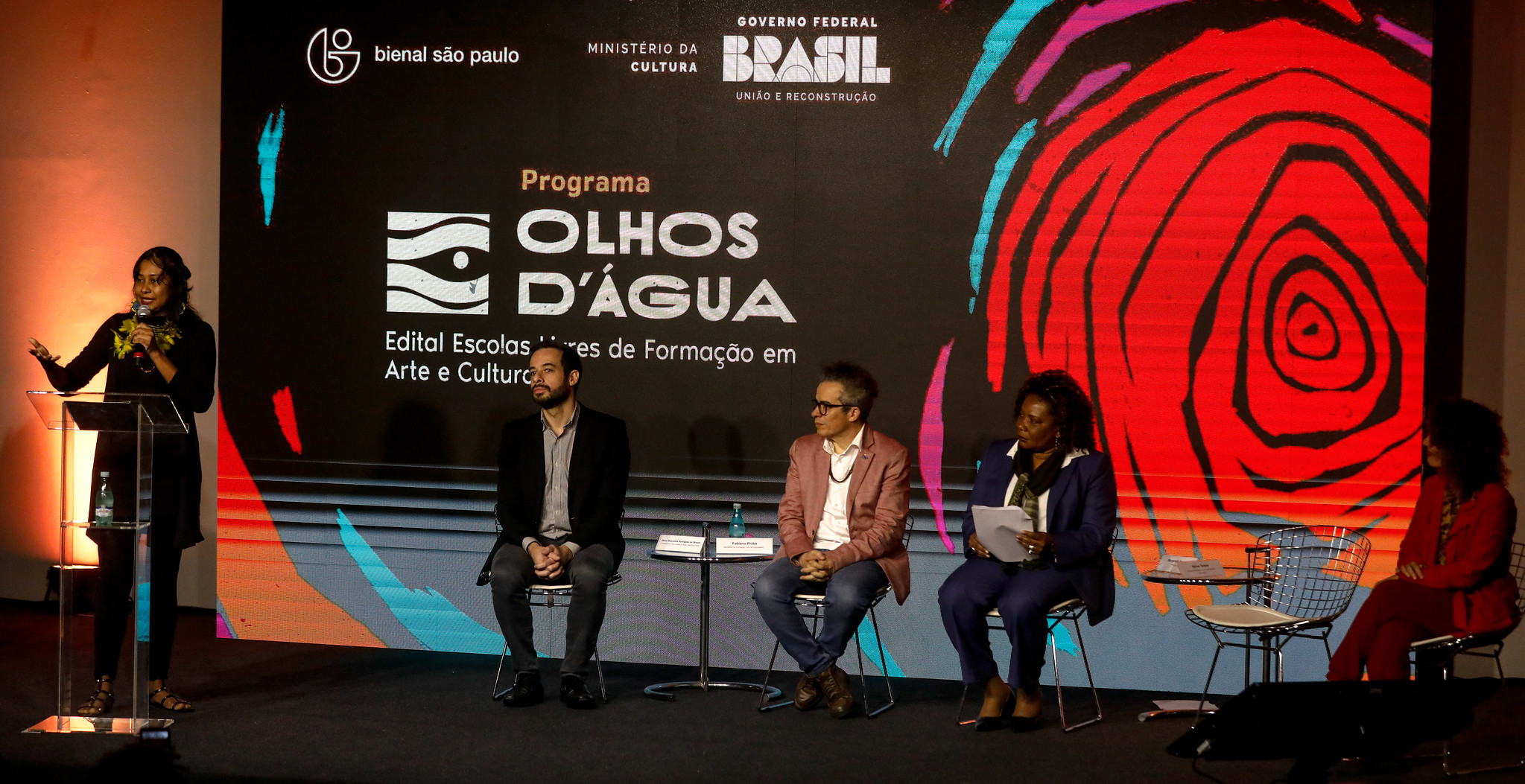 Para fomentar atividades de formação realizadas por espaços não formais de educação e projetos de formação em arte e cultura de organizações da sociedade civil (OSCs), o Ministério da Cultura (MinC), por meio da Secretaria de Formação Cultural, Livro e Leitura (SEFLI), lançou nesta quarta-feira (9) o Programa Olhos d’Água - Edital Escolas Livres de Formação em Arte e Cultura. O evento, na Fundação Bienal, em São Paulo, contou com a presença da ministra da Cultura, Margareth Menezes. A abertura teve apresentação de manifestação cultural com indígenas do povo wassú.