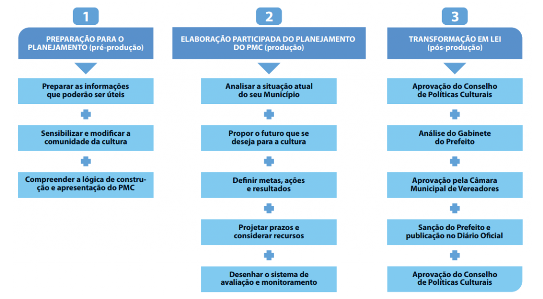 O fluxo apresentado abaixo foi extraído da publicação “Guia de Elaboração dos Planos Municipais de Cultura (página 16)”, elaborado pela Universidade Federal da Bahia (2017). Ele demonstra as principais etapas de elaboração de um plano de cultura.