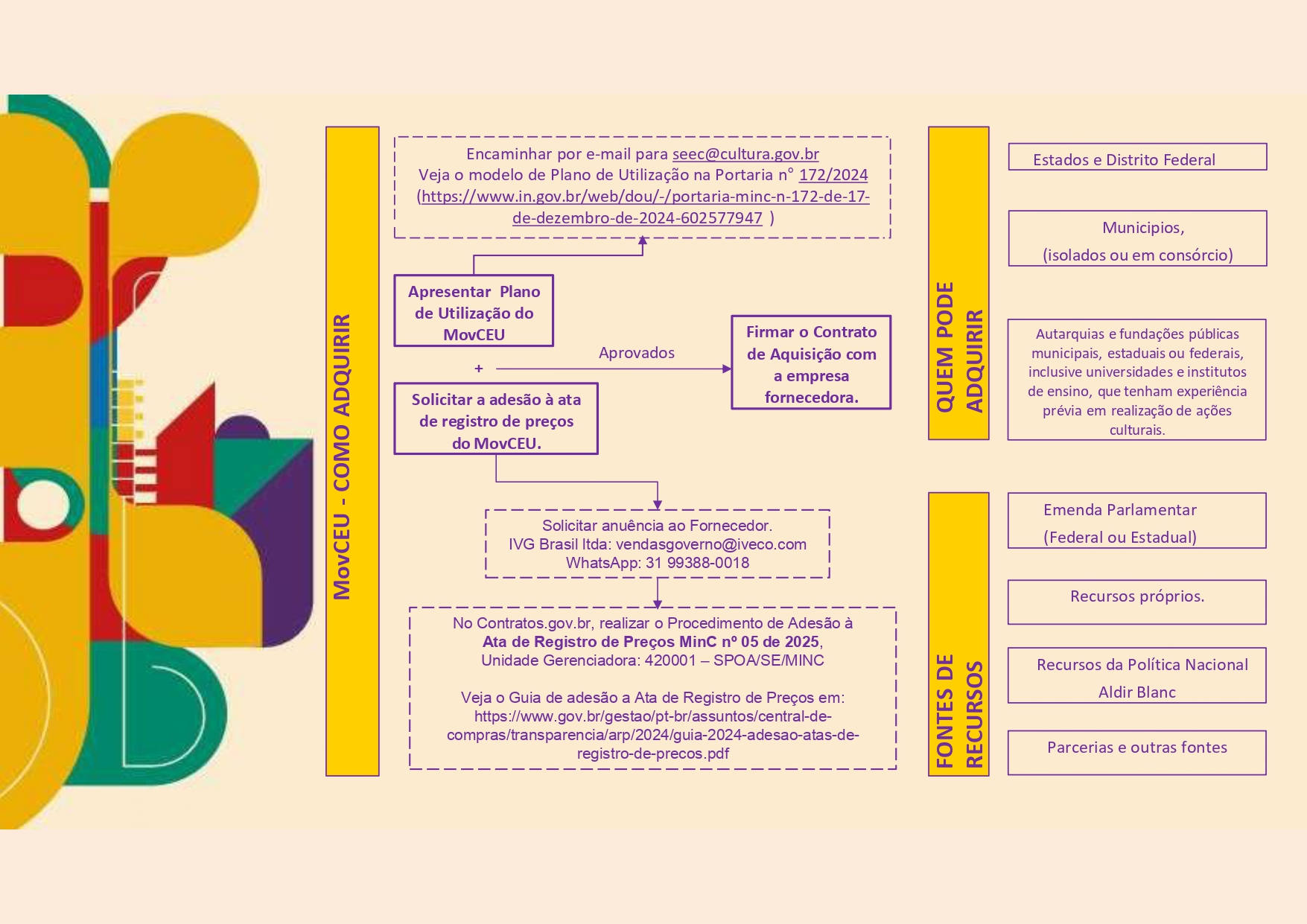 O primeiro processo seletivo para aquisição do MovCEU com recursos diretos do MinC foi concluído em 2023, no entanto, ainda é possível obter o veículo adaptado por meio de recursos dos próprios entes federados ou de emendas parlamentares. Inclusive, a compra pode ser incluída no Plano Anual de Aplicação de Recursos (PAAR) da PNAB.