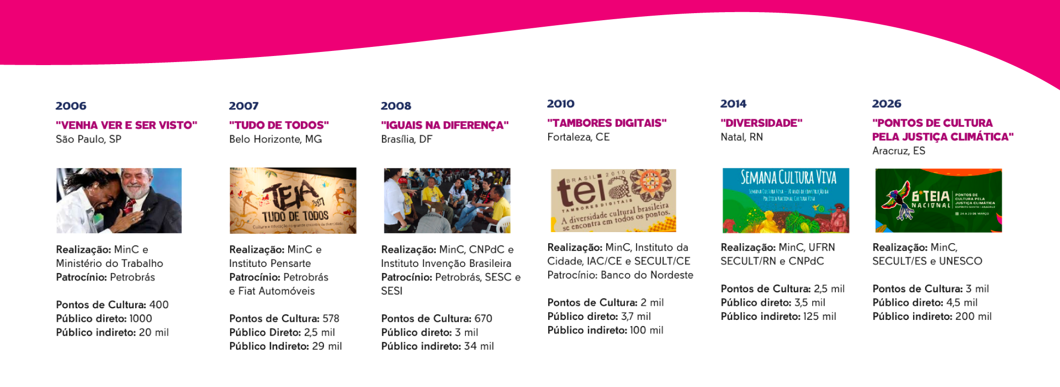 A próxima edição do maior encontro dos pontos de cultura do Brasil será realizada entre os dias 24 e 29 de março de 2026, no município de Aracruz, no Espírito Santo. Os pontos são os grupos e entidades culturais que desenvolvem ações artísticas e comunitárias em seus territórios. Eles passaram a ser reconhecidos pelo Ministério da Cultura em 2004, com a criação do Programa Cultura Viva, que se tornou a Política Nacional de Cultura Viva com a Lei nº 13.018/2014. Hoje, já são mais de 13 mil pontos certificados.
