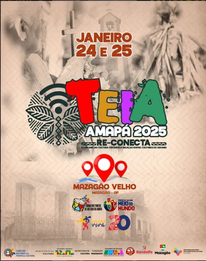 Pelo menos 100 fazedores de cultura de diversos pontos do Amapá participaram da Teia Re-Conecta 2025, na cidade de Mazagão, nos dias 24 e 25 de janeiro de 2025. No evento, foram debatidas as estratégias para a valorização da cultura local e a implementação da Política Nacional de Cultura Viva. O Amapá foi o primeiro estado do país a realizar o encontro preparatório para a sexta edição da Teia Nacional, antes mesmo do anúncio oficial do local e da data do encontro nacional por parte do Ministério da Cultura. Em 20 anos de Cultura Viva, ocorreram cinco encontros nacionais de pontos de cultura: o último foi a Teia da Diversidade, em 2014. A programação da Teia Amapá Re-Conecta contou com palestras, rodas de conversas e ações formativas. Em dois dias de atividades, foram definidas as propostas sobre a Cultura Viva e os representantes do estado para a Teia Nacional. No início de 2025, o Amapá contava com 34 pontos de cultura, distribuídos em cinco municípios. |