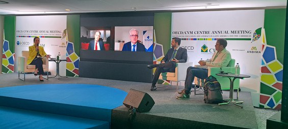 Flore-Anne Messy, Head da Divisão de Financiamento ao Consumidor, Seguros e Previdência da OCDE; Secretária Executiva da Rede Internacional de Educação Financeira da OCDE (INFE); Secretária-Geral da Organização Internacional de Supervisores de Previdência (IOPS); Tomas Soley, Superintendente Geral da SUGESE, Costa Rica e Presidente da Associación de Supervisores de Seguros de América Latina (ASSAL); Iván Pliego Moreno, Presidente da Comisión Nacional del Sistema de Ahorro para el Retiro (CONSAR) do México e Presidente da Asociación Internacional de Organismos de Supervisión de Fondos de Pensiones (AIOS); João Pedro Nascimento, Presidente da CVM; Pasquale Munafò, Presidente do Comitê de Investidores de Varejo da International Organisation of Securities Commissions (IOSCO).
