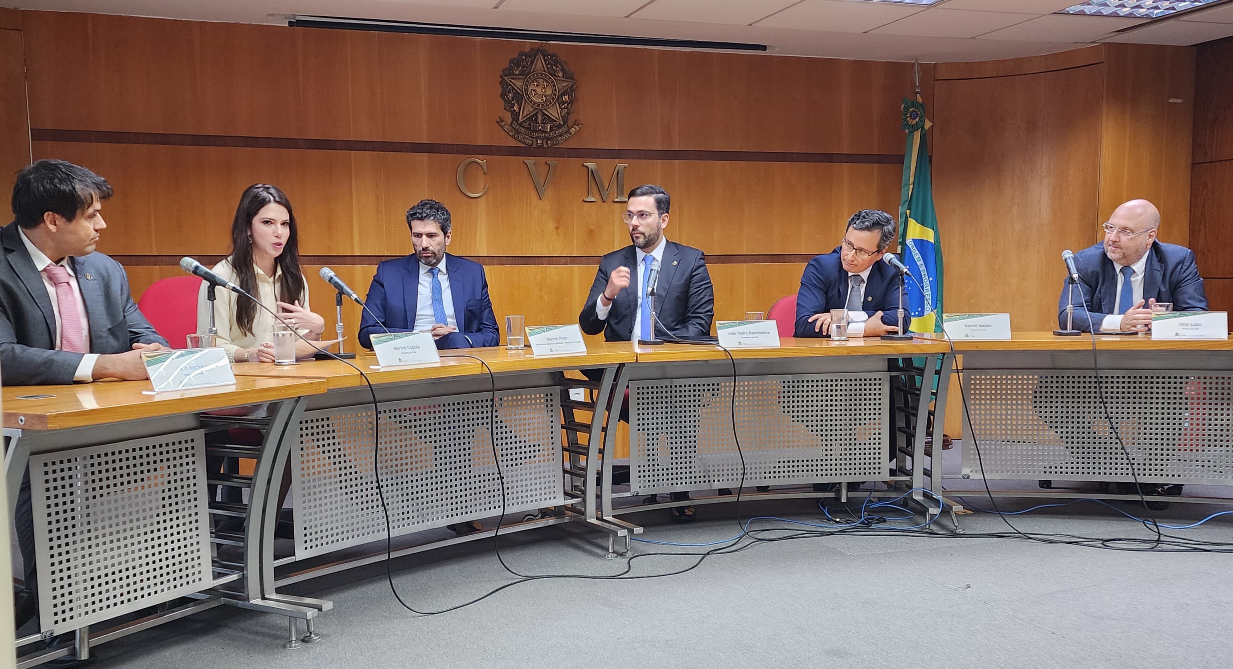 (esq. p/ dir.) João Accioly (Diretor da CVM), Marina Copola (Diretora da CVM), Marcos Pinto (Secretário de Reformas Econômicas do Ministério da Fazenda), João Pedro Nascimento (Presidente da CVM), Daniel Maeda (Diretor da CVM) e Otto Lobo (Diretor da CVM)