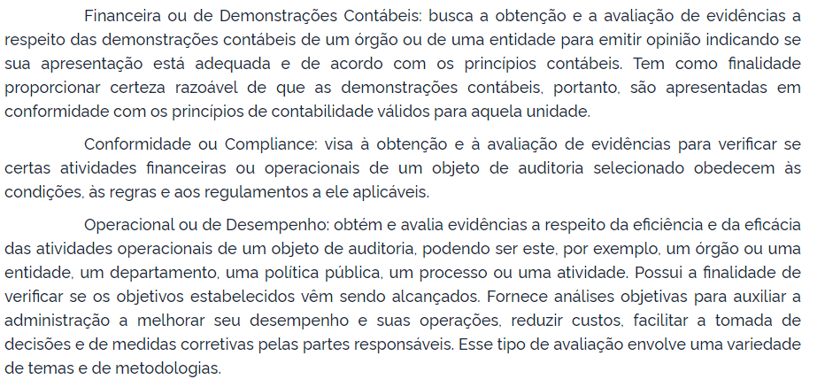 Conformidade ou Compliance: visa à obtenção e à avaliação de evidências para verificar se certas atividades financeiras ou operacionais de um objeto de auditoria selecionado obedecem às condições, às regras e aos regulamentos a ele aplicáveis.