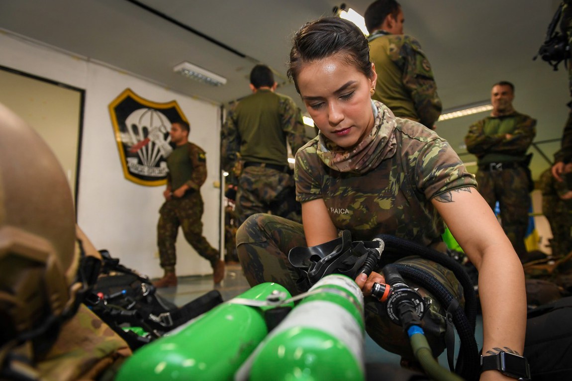 A Sargento Ranielle Raica Finatto, da Força Aérea, do Esquadrão Aeroterrestre de Salvamento, é uma das responsáveis pela manutenção de equipamentos na missão. Seu trabalho é essencial para a segurança dos militares paraquedistas, pois é ela que verifica todos os materiais, monitora a dobragem dos paraquedas e confere equipagem da aeronave, para que tudo esteja pronto para o salto.