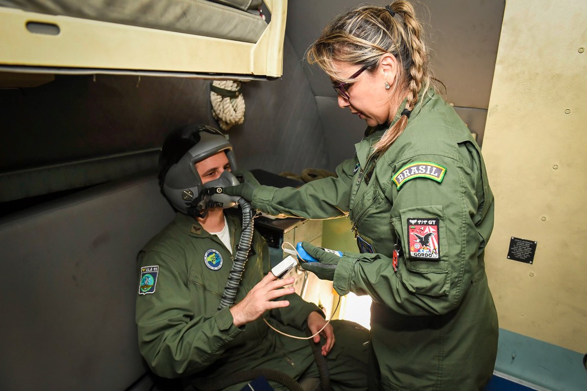 Para melhor bem-estar dos paraquedistas no voo, conforme a militar, antes de saltar eles fazem um tratamento em uma câmara hipobárica, no Instituto Médico da Aeronáutica (IMAE). Nesse ambiente eles vão conhecer sintomas que se apresentam em ambiente de alta altitude. "Cada um, nesse treinamento simulado, tira a máscara, em uma determinada altitude, para saber seus sintomas quando há diminuição de oxigênio no organismo", esclarece. A Capitão Vandesteen explica que os militares paraquedistas podem sentir dor de cabeça, dormência, visão em túnel, entre outros, quem variam de pessoa para pessoa. Caso o militar apresente algum desses sintomas no voo, o médico acopla melhor a máscara de oxigênio e orienta respirar devagar.