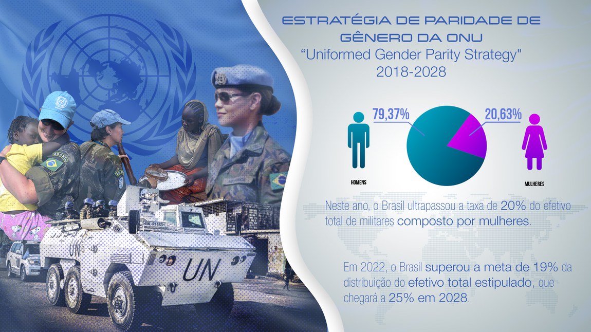 O Brasil superou, em 2022, o percentual de 20% do efetivo total de agentes de segurança formado por mulheres para atuar em missões internacionais de paz da Organização das Nações Unidas (ONU). O número ficou acima da estratégia de paridade de gênero criada pela organização ꟷ “Uniformed Gender Parity Strategy" 2018-2028 ꟷ sobre participação de mulheres, por país contribuinte, nas missões individuais e que fixou um mínimo de 19% do efetivo total, até chegar a 25% em 2028. O tema "Igualdade de Gênero" é um dos objetivos de desenvolvimento sustentáveis da Agenda 2030 de Desenvolvimento Sustentável da ONU.