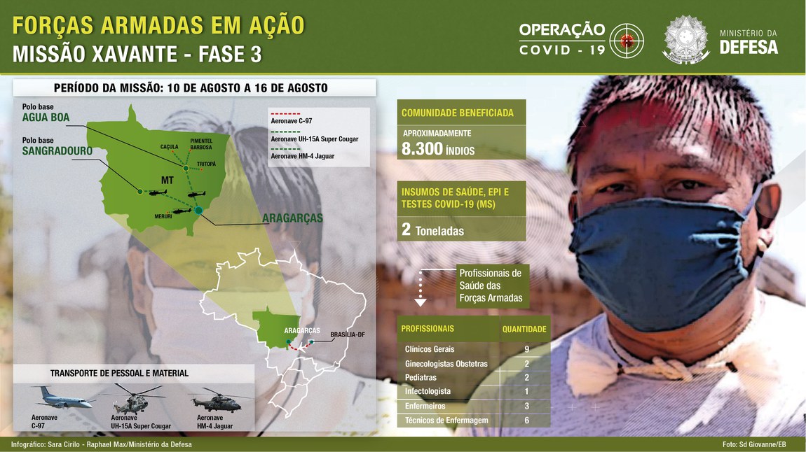 Brasília (DF), 11/08/2020 - Na segunda-feira (10), uma equipe de saúde multidisciplinar das Forças Armadas partiu de Brasília rumo ao município de Barra do Garças, no estado de Mato Grosso. Trata-se da terceira e última etapa da Missão Xavante, operação interministerial envolvendo as Pastas da Defesa e da Saúde, com o intuito de reforçar o combate à COVID-19 em comunidades indígenas da região Centro-Oeste do Brasil.