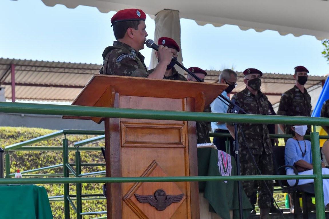 “Agradeço a todos. Tenho orgulho enorme de colocar o boot, a boina e usar o brevê prateado”, discursou o General Ramos, mencionando os símbolos da Brigada de Infantaria Paraquedista: a boina grená, as botas marrons e o brevê em formato de asas prateadas. “Essa é a Brigada que sempre me inspirou. Paraquedista é algo que devemos ter sempre na alma e no espírito”, disse ele, dando ânimo aos militares que o escutavam e ora seguem por esse caminho.