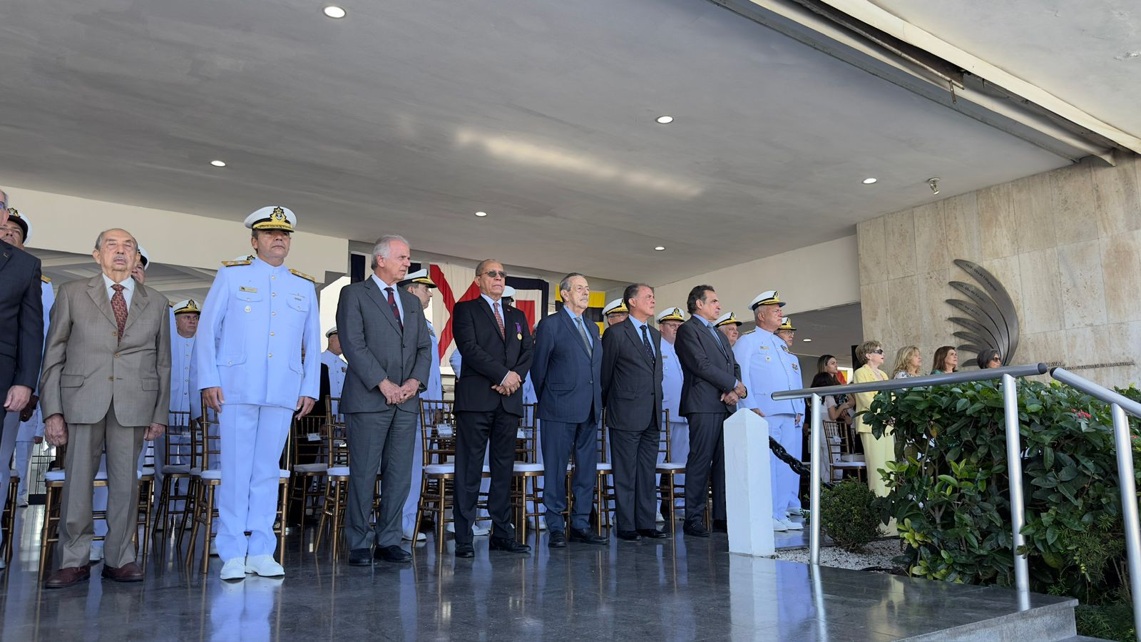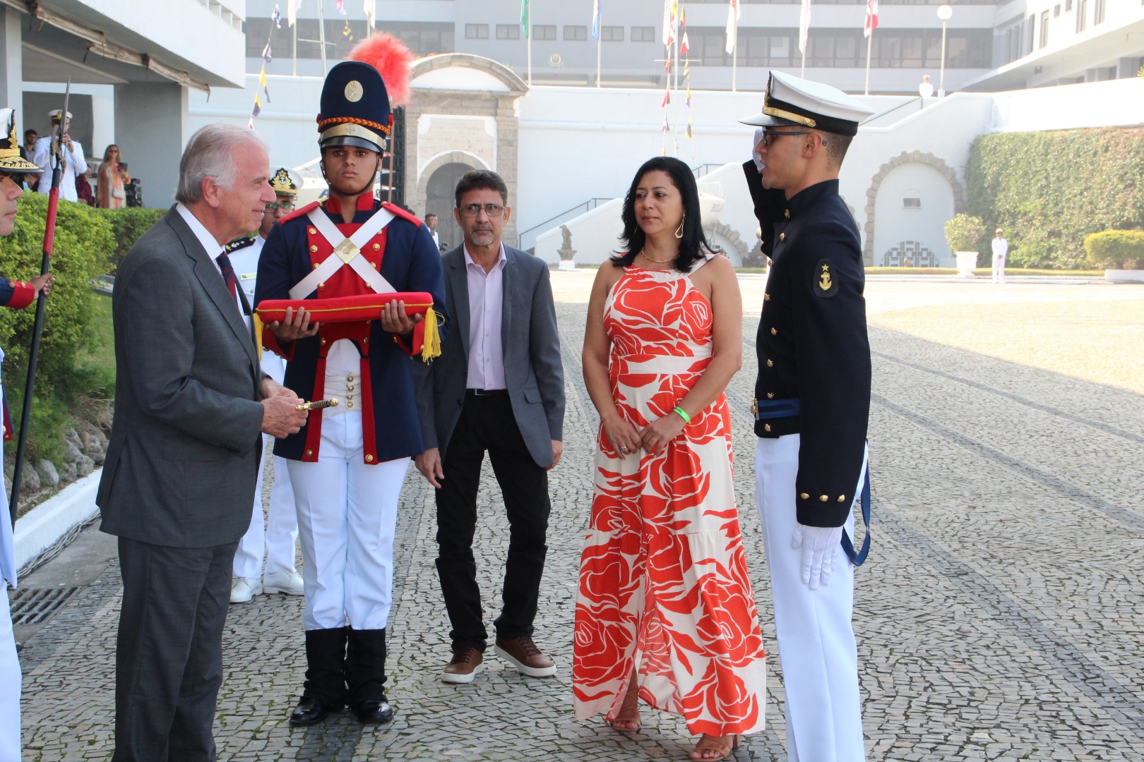 Na ocasião, o Ministro José Mucio, acompanhado do Comandante da Marinha do Brasil (MB), Almirante de Esquadra Marcos Sampaio Olsen, entregou o espadim ao Chefe de Classe da turma, Aspirante Luiz Alberto Perdigão Braga.