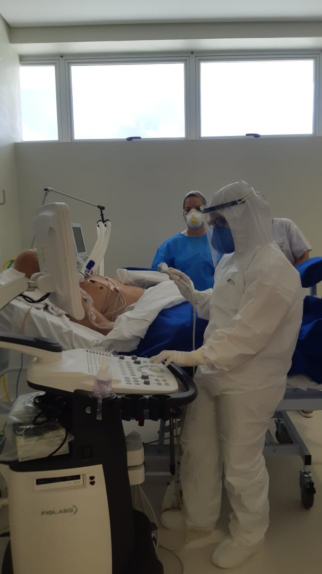 No contexto da Operação Covid-19, militares da área de saúde das Forças Armadas capacitam médicos do Hospital Universitário, no Amapá, em procedimentos técnicos, durante a realização de ultrassonografia à beira do leito dos pacientes. Os treinamentos também incluem programa de instruções para profissionais de enfermagem sobre paramentação, desparamentação, registro em enfermagem, diluições e outros tópicos importantes no contato com o paciente internado, tanto em leito de enfermaria, quanto no Centro de Tratamento e Terapia Intensiva (CTI).