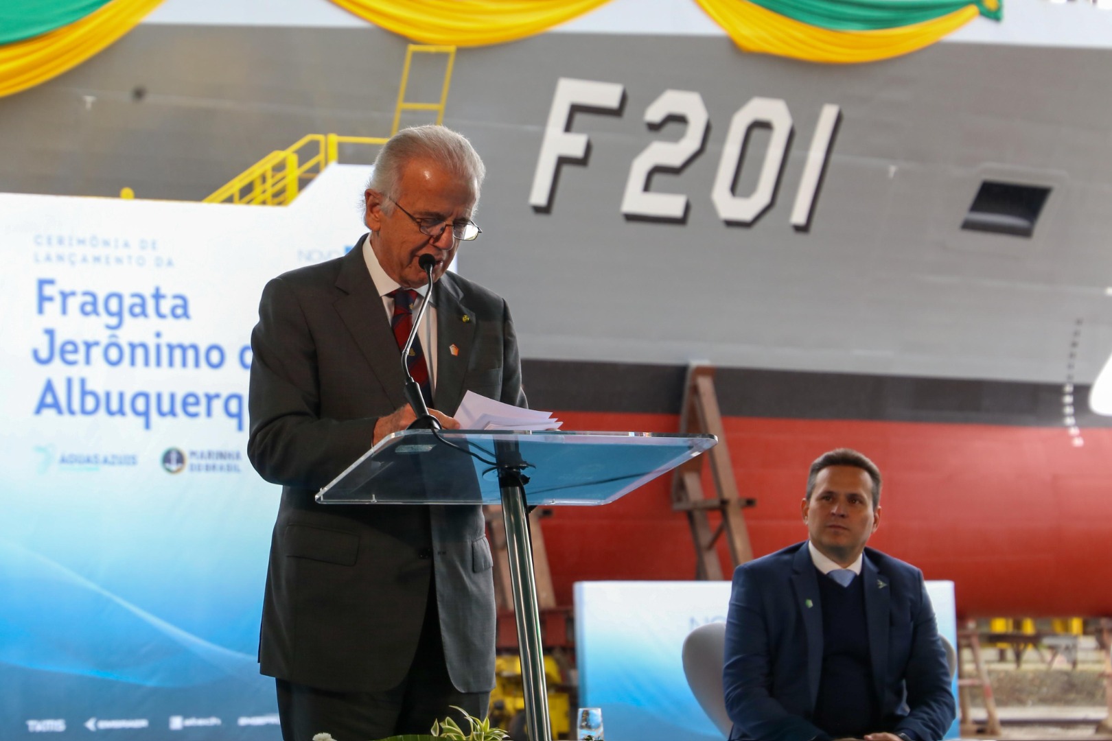 Brasília (DF), 8/8/2025 - O Ministro da Defesa, José Múcio Monteiro, enfatizou, nesta sexta-feira (8), que os projetos estratégicos da Marinha, do Exército e da Força Aérea são molas impulsionadoras da indústria de defesa nacional, representam a pujança tecnológica e geram contribuições para o desenvolvimento do país. A declaração ocorreu durante a cerimônia de batismo e lançamento da Fragata Jerônimo de Albuquerque, em Itajaí (SC).