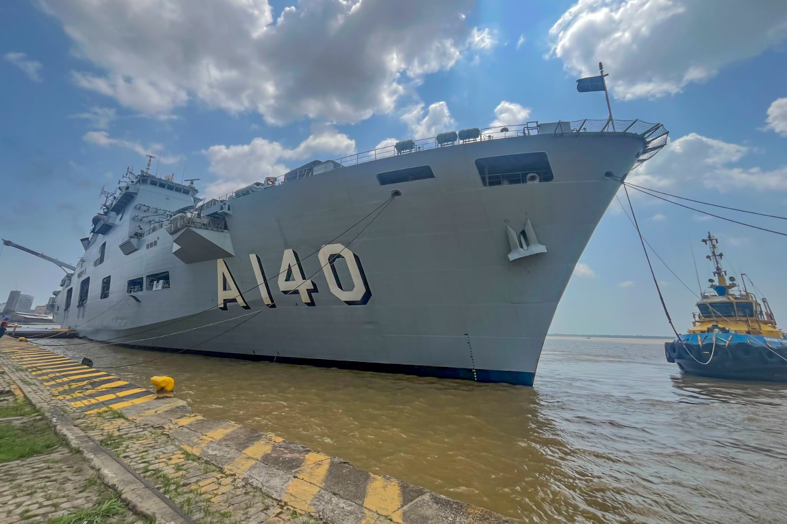 Brasília (DF), 26/09/2025 – O Navio-Aeródromo Multipropósito (NAM) “Atlântico”, maior navio de guerra da América Latina, atracou em Belém (PA) nesta quinta-feira (25). A mobilização integra o planejamento do Ministério da Defesa para a Operação Atlas e o apoio à Conferência das Nações Unidas sobre as Mudanças Climáticas de 2025 (COP 30).