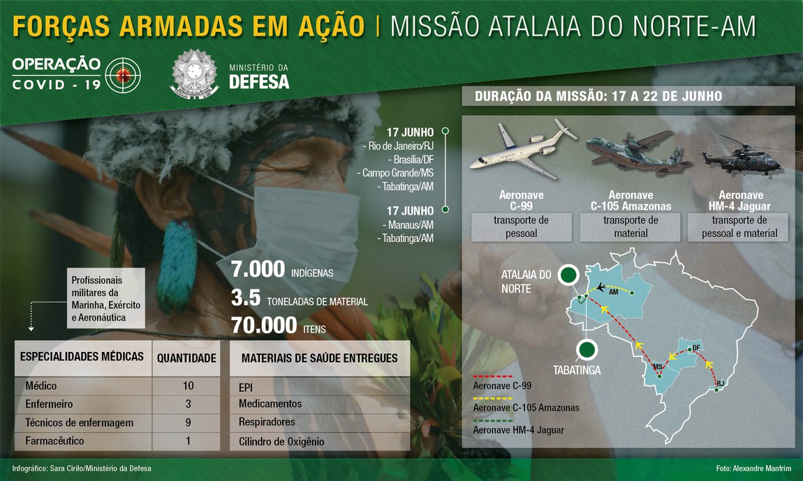 “Apoiamos e cuidamos da população que se encontra em localidades de difícil acesso, e nela se incluem muitos indígenas, graças ao trabalho das Forças Armadas, em conjunto com outros Ministérios e Órgãos. Já levamos médicos e insumos para as regiões do Alto Rio Negro e do Alto Solimões. A intenção, agora, é continuar trabalhando de forma ininterrupta para minimizar os efeitos da COVID-19 nessas áreas”, disse o Secretário.