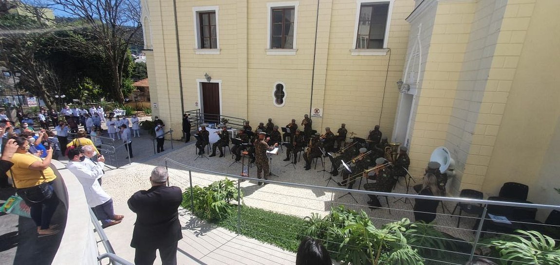 Em homenagem aos profissionais de saúde da Santa Casa de Misericórdia de Juiz de Fora (MG), a Banda de Música do 10º Batalhão de Infantaria Leve de Montanha realizou uma apresentação musical, em espaço aberto, no dia 19 de agosto. No repertório, canções populares e internacionais.