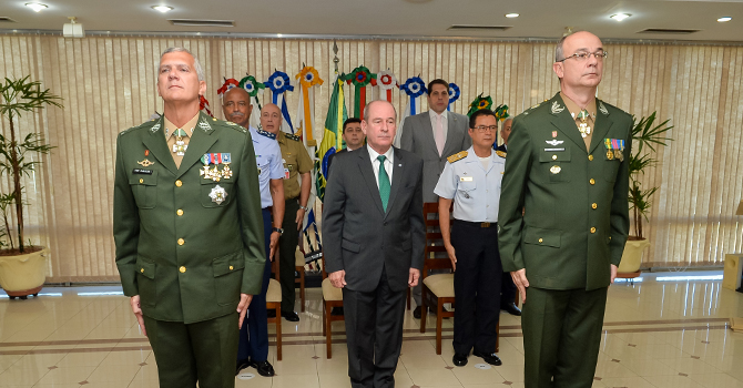 Brasília, 04/07/2019 – Na tarde desta quinta-feira (4), o salão nobre do Ministério da Defesa (MD) ficou repleto de convidados, civis e militares, para a cerimônia de despedida do serviço ativo do General de Divisão Eduardo Castanheira Garrido Alves e a transmissão de cargo de assessor especial do Gabinete para o General de Brigada André Bastos Silva.