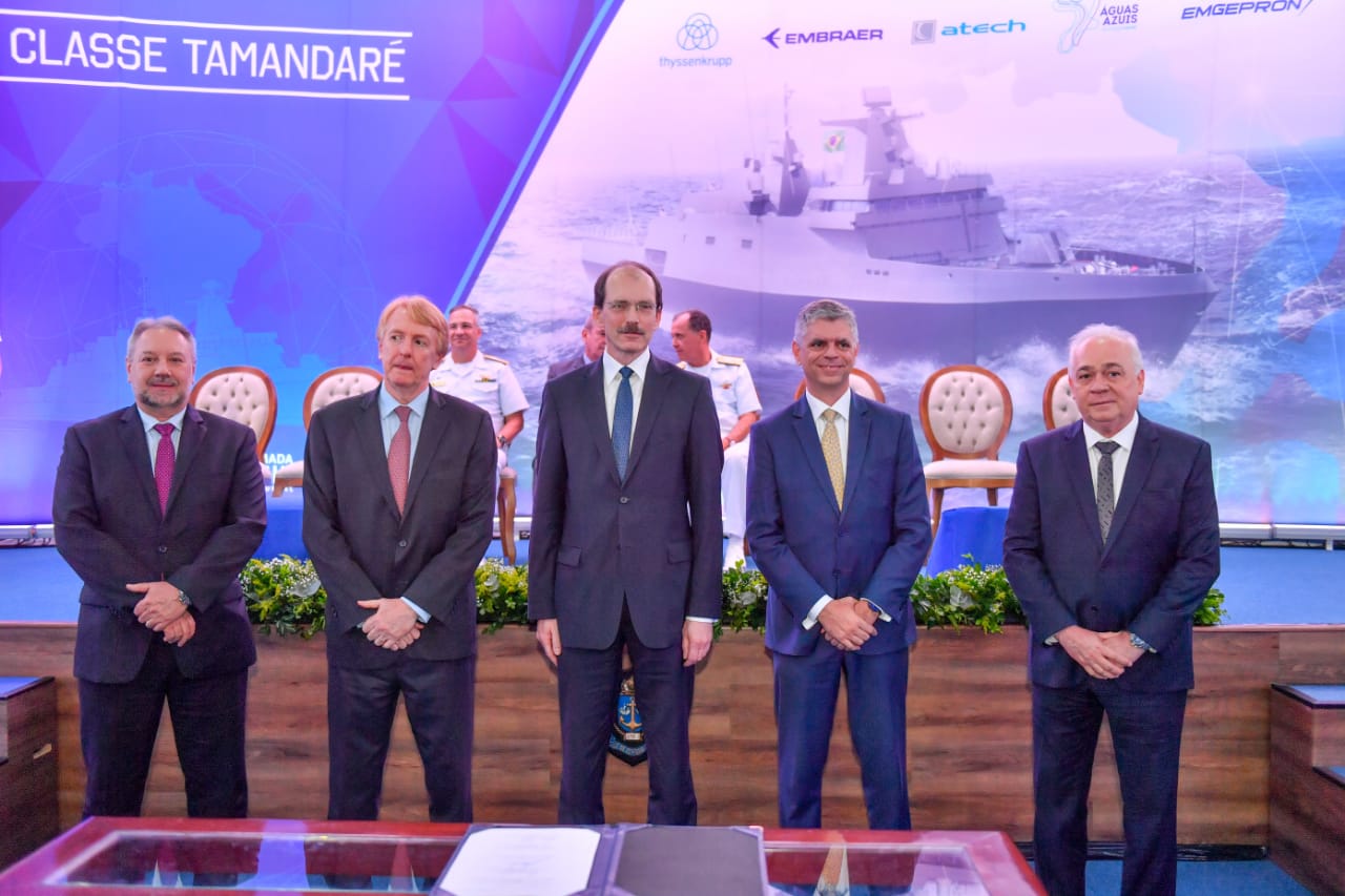 Foi realizada na tarde desta quinta-feira (5), no Arsenal de Marinha no Rio de Janeiro (AMRJ), a assinatura do contrato para a construção de quatro Fragatas da Classe Tamandaré. A Empresa Gerencial de Projetos Navais (EMGEPRON) é a gerente do contrato firmado com o consórcio vencedor, composto pela Embraer Defesa & Segurança, Thyssenkrupp Marine Systems e Atech. A partir de agora tem início a fase de projeto executivo, onde serão detalhadas as fases de construção das embarcações. A previsão é de que o primeiro navio fique pronto em 2025.