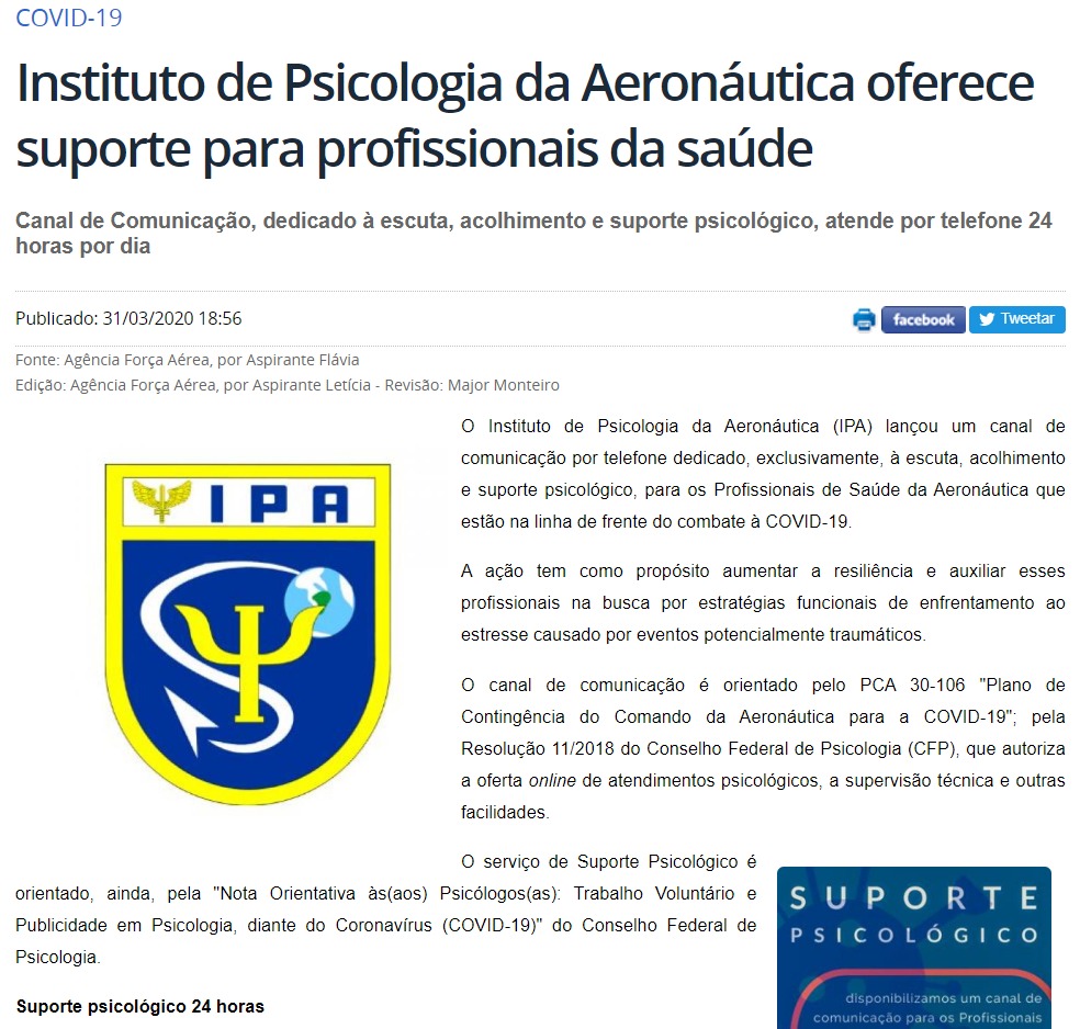 No âmbito da Força Aérea Brasileira (FAB), o Instituto de Psicologia da Aeronáutica (IPA) lançou canal de comunicação por telefone dedicado, exclusivamente, à escuta, acolhimento e suporte psicológico, para os Profissionais de Saúde da Aeronáutica que estão na linha de frente do combate à COVID-19. A ação tem como propósito aumentar a resiliência e auxiliar na busca por estratégias funcionais de enfrentamento ao estresse causado por eventos potencialmente traumáticos. O serviço é oferecido por uma equipe de psicólogos voluntários em regime de plantão de sobreaviso 24 horas e em teletrabalho.