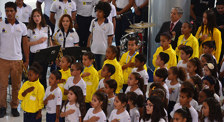 Brasília, 29/08/2018 – Oitenta e duas crianças e adolescentes do Programa Segundo - Tempo Forças no Esporte (Profesp) entoaram o Hino Nacional na solenidade em comemoração ao Dia Nacional do Voluntariado. O evento ocorreu, na terça (28), no Palácio do Planalto.