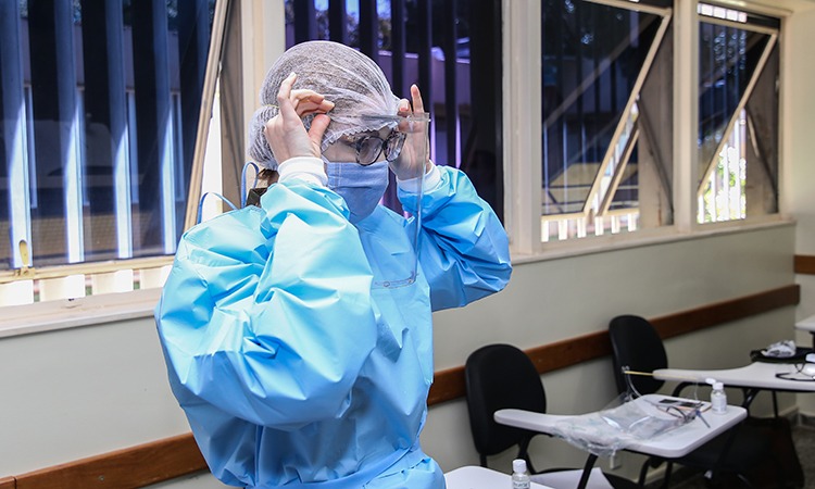 Nesta manhã, dentro da proposta de promover ensinamentos básicos e específicos para o combate ao coronavírus, foram ministradas aulas sobre o uso adequado de Equipamentos de Proteção Individual (EPI), sobre como operar o ventilador mecânico e realizar intubação em pacientes portadores de COVID-19.