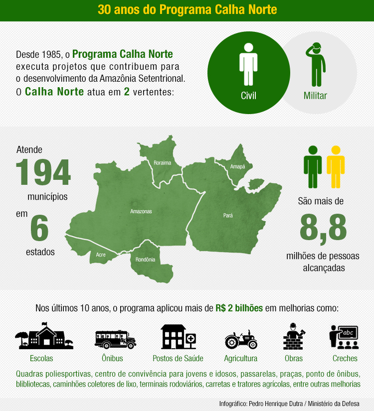 Neste sábado (19), o Programa Calha Norte (PCN) – uma das ações sociais mais importantes do Ministério da Defesa (MD) – completa 30 anos de criação. A iniciativa promove a realização de obras de infraestrutura básica, como energia elétrica e construção de pontes. Também prevê assistência direta à sociedade, com atendimentos médico e odontológico. E, ainda, realiza atividades esportivas e de educação.