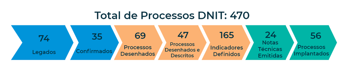 Ao fim de 2019, dos 470 processos mapeados pelo DNIT, 56 estavam implantados, conforme figura abaixo:
