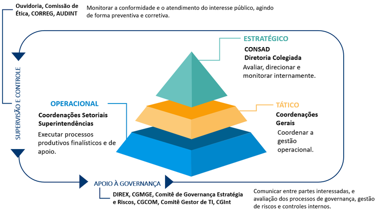 As instâncias que suportam a estrutura de governança são constituídas por um conjunto de pessoas com atribuições, responsabilidades, vinculações funcionais, em diferentes níveis hierárquicos, funcionando de forma orquestrada para o cumprimento dos objetivos estratégicos, por meio do monitoramento de indicadores e metas estabelecidas.