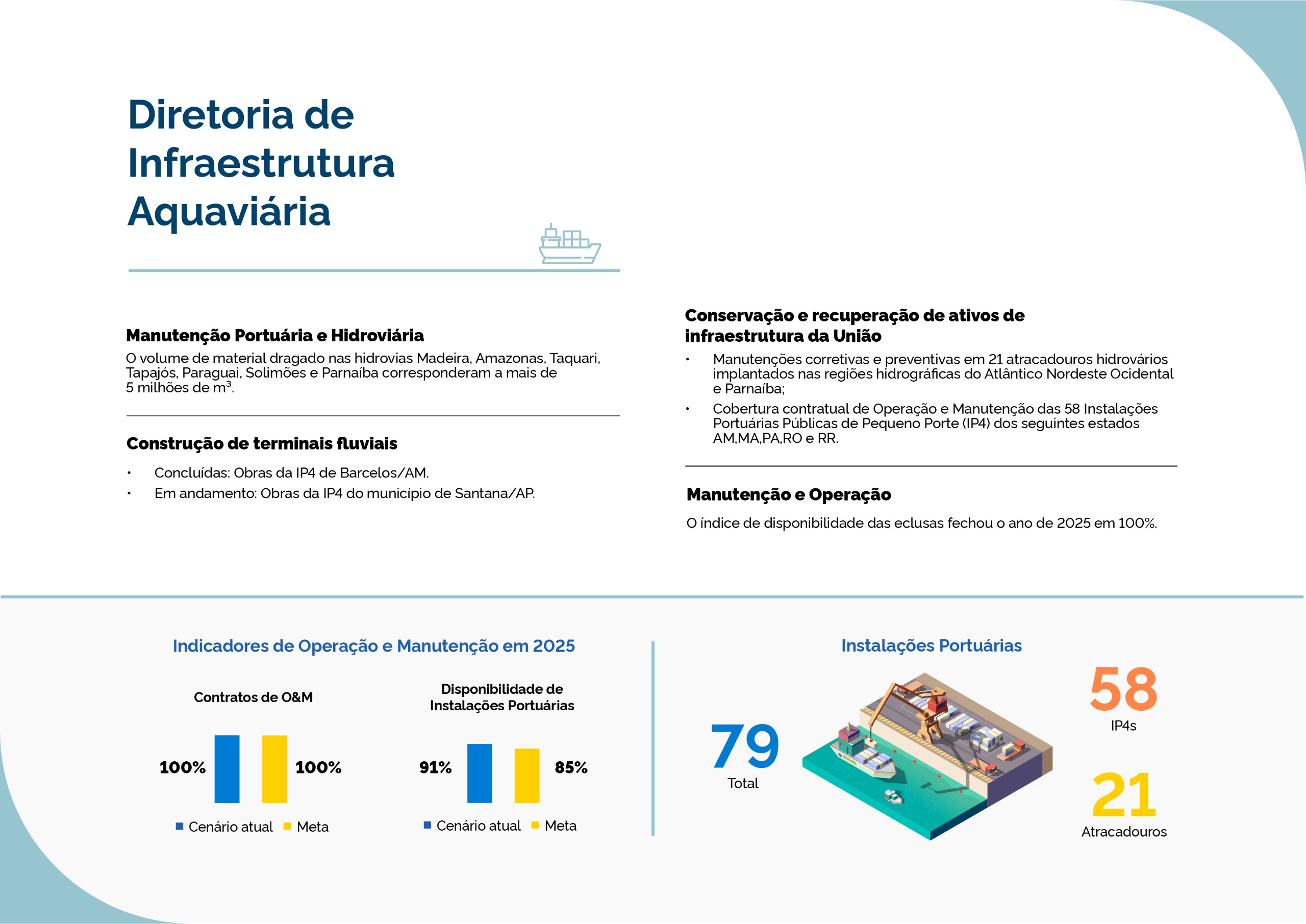 Complementarmente, destacam-se os resultados nas ações de navegabilidade, com a execução de campanhas de dragagem e sinalização em hidrovias prioritárias, profundidade adequada, segurança da navegação e fluxo contínuo de cargas e passageiros. Foram realizadas campanhas em bacias estratégicas como Amazonas, Madeira, Paraguai, Parnaíba e Taquari, além do avanço nos estudos, planos de monitoramento e projetos que darão suporte ao ciclo de investimentos dos próximos anos.