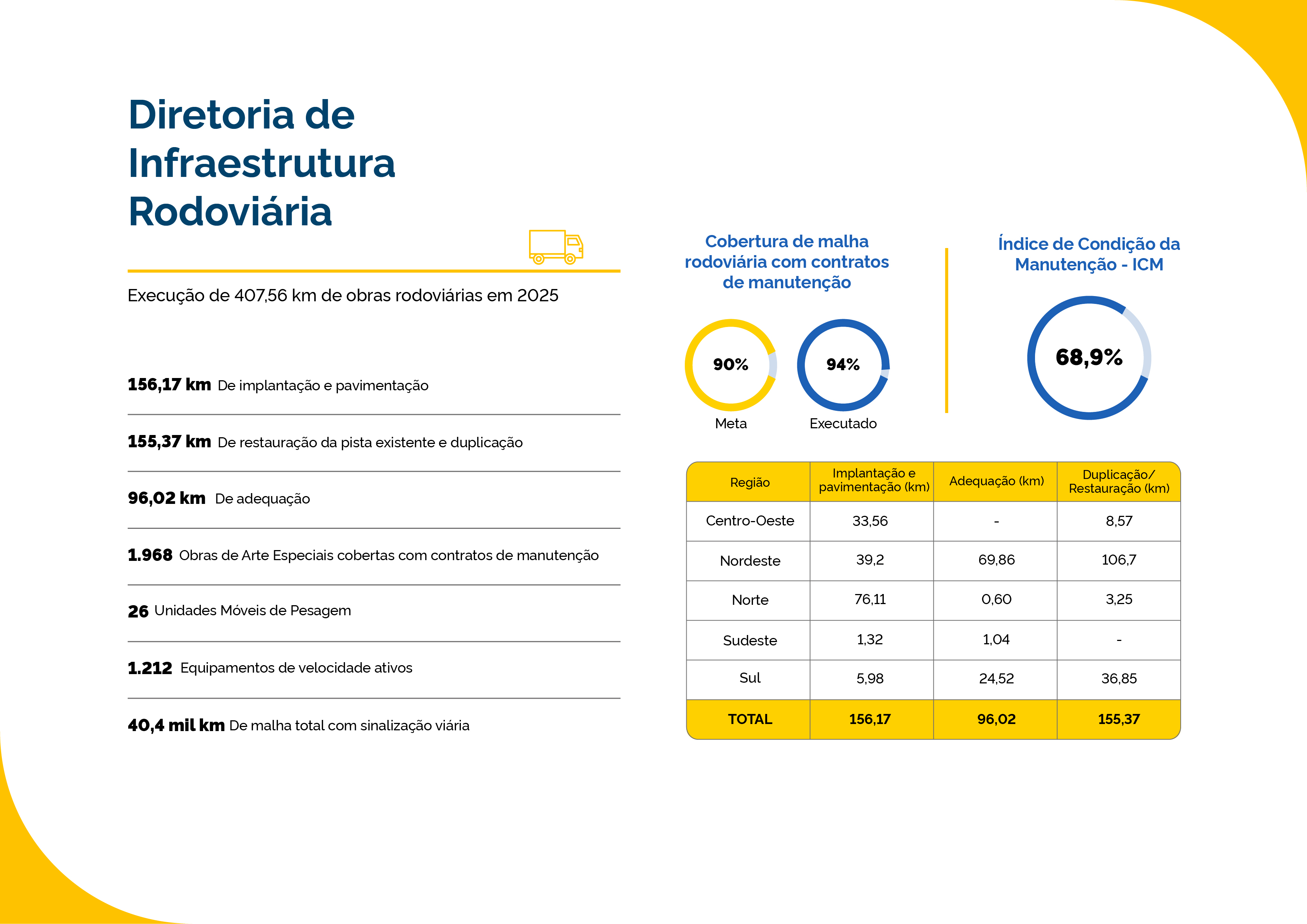 Em relação à infraestrutura rodoviária, foram investidos cerca de R$ 8,6 bilhões em ações de manutenção, conservação e recuperação das rodovias, além de ações emergenciais, que foram intensificadas no período. O Índice de Condição da Manutenção (ICM) alcançou 68,9%. Ainda, foram executados 407,56 Km de obras rodoviárias, abrangendo 156,17 km de implantação e pavimentação, 96,02 km de adequação e 155,37 km de duplicação com restauração da pista existente.