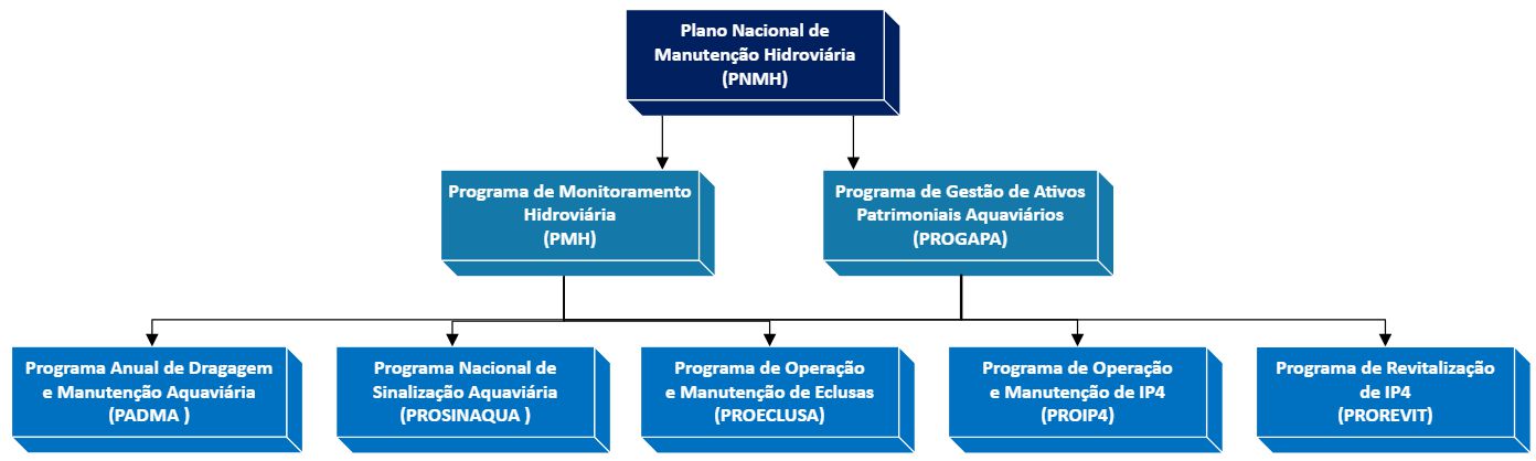 O PNMH atua como a estrutura macro de gestão da Diretoria de Infraestrutura Aquaviária (DAQ), integrando seis programas setoriais: Programa de Monitoramento Hidroviário (PMH), Programa Anual de Dragagem de Manutenção Aquaviária (PADMA), Programa Nacional de Sinalização Aquaviária (PROSINAQUA), Programa de Operação e Manutenção de Eclusas (PROECLUSAS), Programa de Operação e Manutenção de IP4 (PROIP4) e Programa de Revitalização de IP4 (PROREVIT), e o recém-criado Programa de Gestão de Ativos Patrimoniais Aquaviários (PROGAPA).