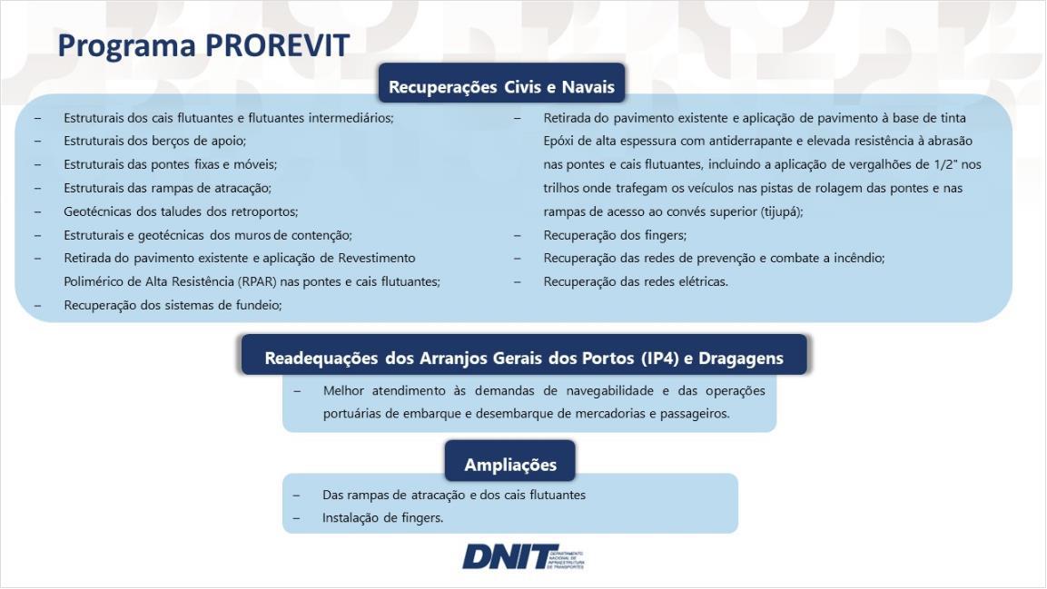 O PROREVIT é um novo programa destinado a abarcar as intervenções de recuperação estrutural, modernização, construção, readequação e ampliação das Instalações Civis e Navais das IP4s. O principal objetivo do Programa PROREVIT é assegurar a estabilidade de todo o Sistema Portuário, incluindo retroporto, rampa, ponte fixa, pontes móveis, berços, flutuantes intermediários e cais flutuante. As obras civis retroportuárias e/ou navais de atracação/acostagem visam garantir a segurança operacional do Porto (IP4), além de contribuir com a saúde e segurança dos usuários e preservação do Patrimônio Público. O programa é vital para corrigir o passivo de degradação e a perda de patrimônio público. Seu escopo abrange:
