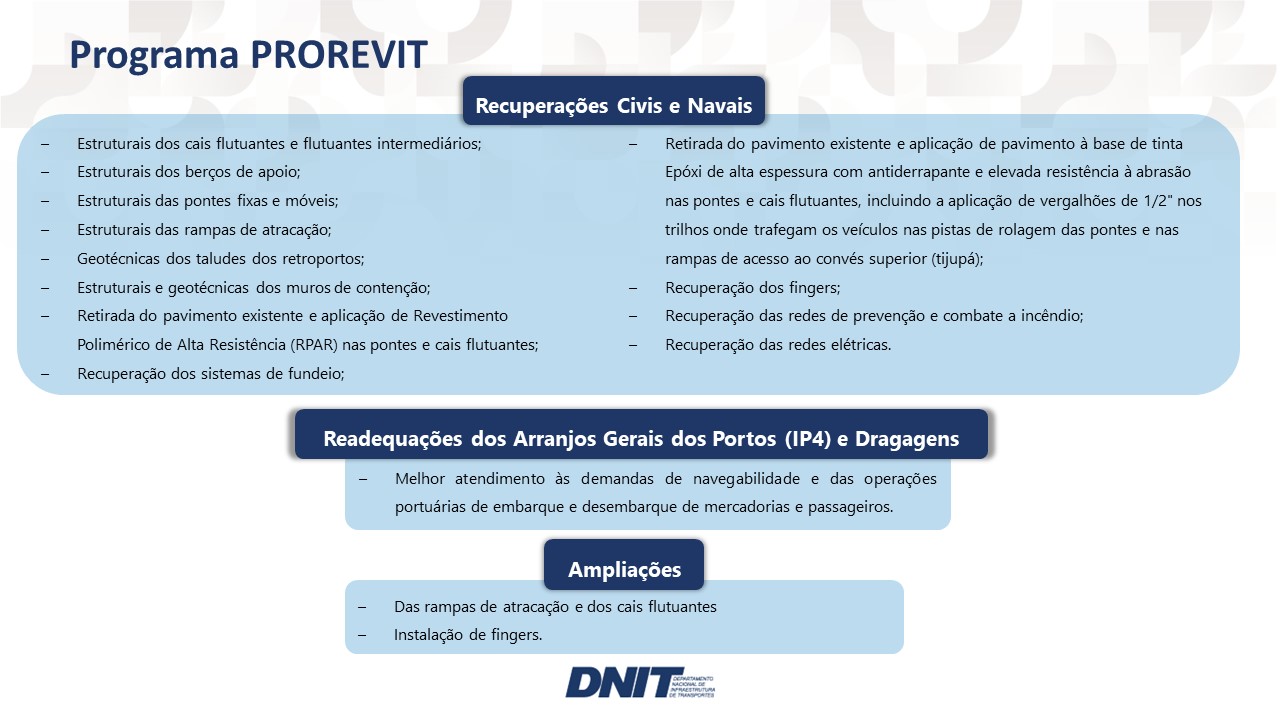 Portanto, o principal objetivo do Programa PROREVIT é assegurar a estabilidade de todo o Sistema Portuário, incluindo retroporto, rampa, ponte fixa, pontes móveis, berços, flutuantes intermediários e cais flutuante. As obras civis retroportuárias e/ou navais de atracação/acostagem visam garantir a segurança operacional do Porto (IP4), além de contribuir com a saúde e segurança dos usuários e preservação do Patrimônio Público.