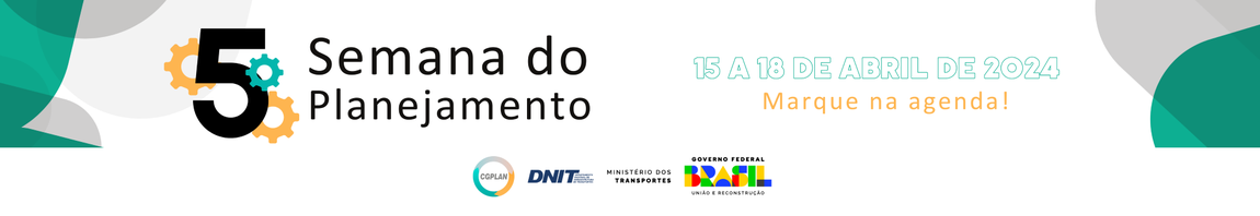 A Semana do Planejamento está se aproximando em sua 5ª edição. O evento ocorrerá entre os dias 15 e 18 de abril de 2024, nas instalações do DNIT/Sede em Brasília/DF. A expectativa é de que supere todas as edições anteriores. A 5ª Semana do Planejamento tem como objetivo criar um ambiente propício para a troca de experiências entre profissionais, pesquisadores e empresas, promovendo networking e parcerias estratégicas.