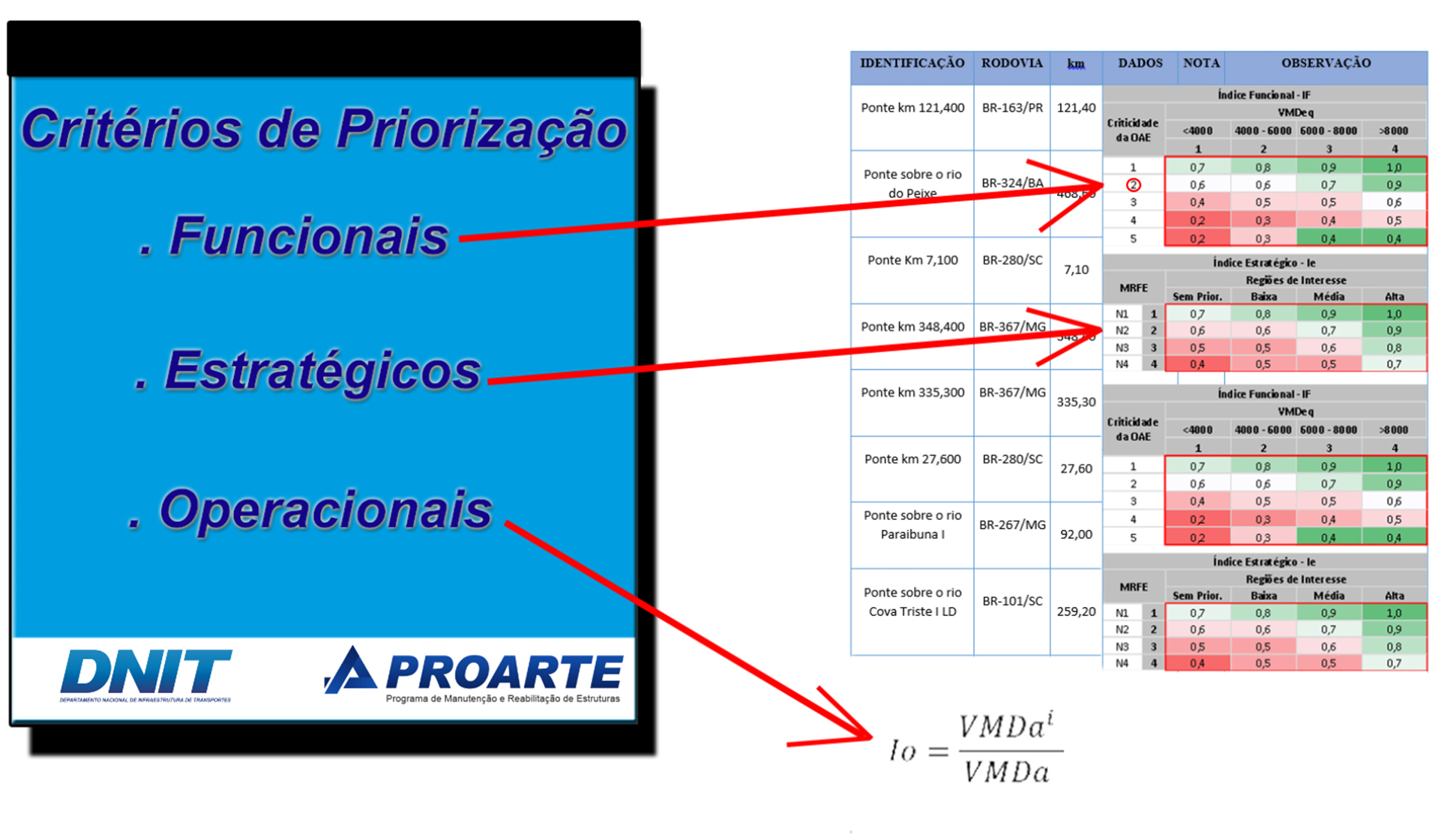 Os critérios utilizados para a priorização das OAEs contempladas pelo PROARTE estão descritos no Plano Nacional de Manutenção Rodoviária (PNMR).