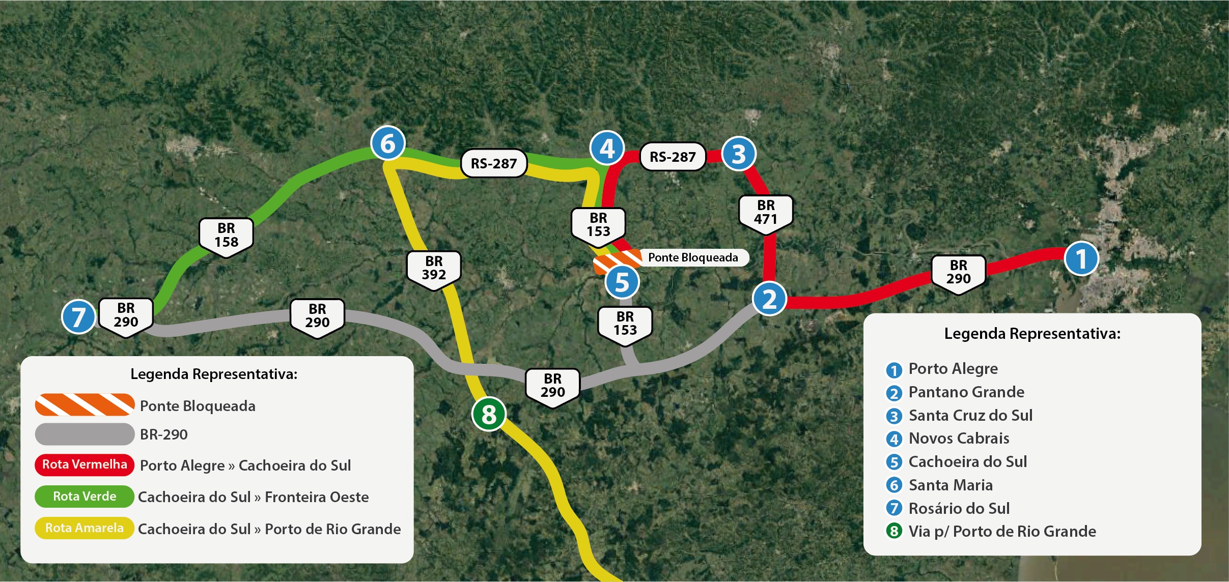O Departamento Nacional de Infraestrutura de Transportes - DNIT informa a interdição total da Ponte do Fandango, localizada na BR-153/RS, por parte da Defesa Civil do Município de Cachoeira do Sul/RS, a partir desta sexta-feira (06/07). A decisão de restringir o tráfego total na ponte visa tanto a segurança dos usuários da rodovia quanto da estrutura da ponte, respeitando laudo técnico apresentado após vistoria feita no local. Os usuários da BR-153/RS poderão utilizar rotas alternativas conforme mapa abaixo: