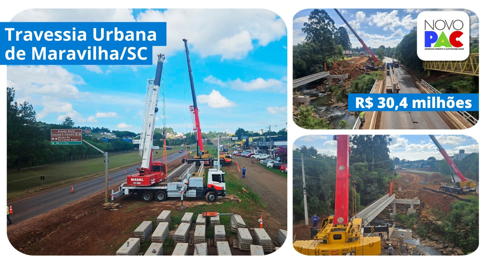 As obras de implantação de vias marginais na BR-282/SC, na Travessia Urbana de Maravilha, no Oeste catarinense, estão em andamento. Com recursos do Novo PAC, o investimento é de R$ 30,4 milhões e contempla um trecho de 3,4 quilômetros, entre os km 604,3 e 607,7 da rodovia.