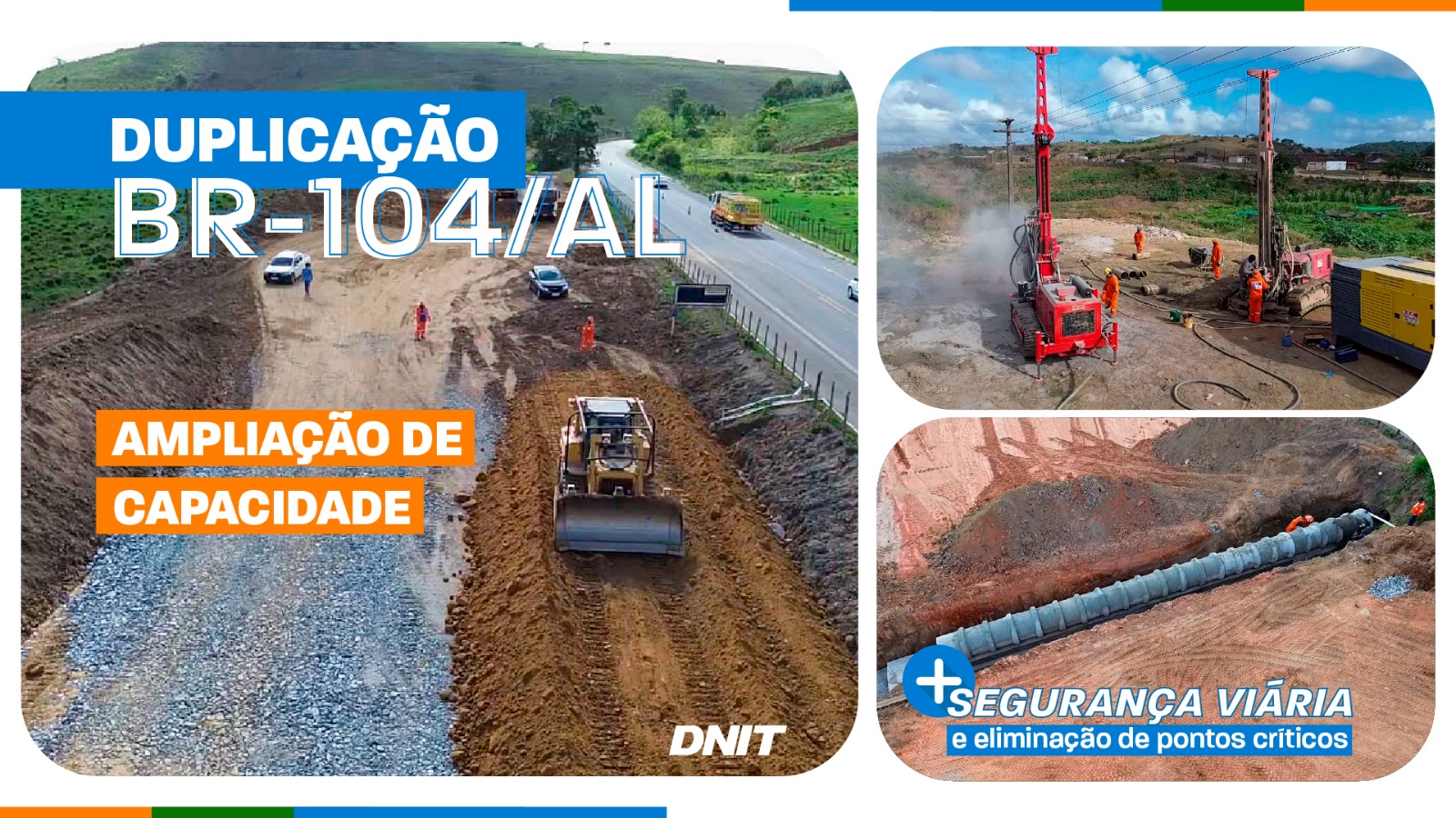 Em Alagoas, o Departamento Nacional de Infraestrutura de Transportes (DNIT) avança com as obras de duplicação de 28,3 quilômetros da BR-104/AL, entre Messias e Branquinha (lote 2A), e de outros 12,7 quilômetros, entre União dos Palmares e Branquinha (lote 1B). O projeto prevê a duplicação da rodovia e a implantação de pontes, viadutos e vias marginais, promovendo mais segurança viária e a eliminação de pontos críticos.