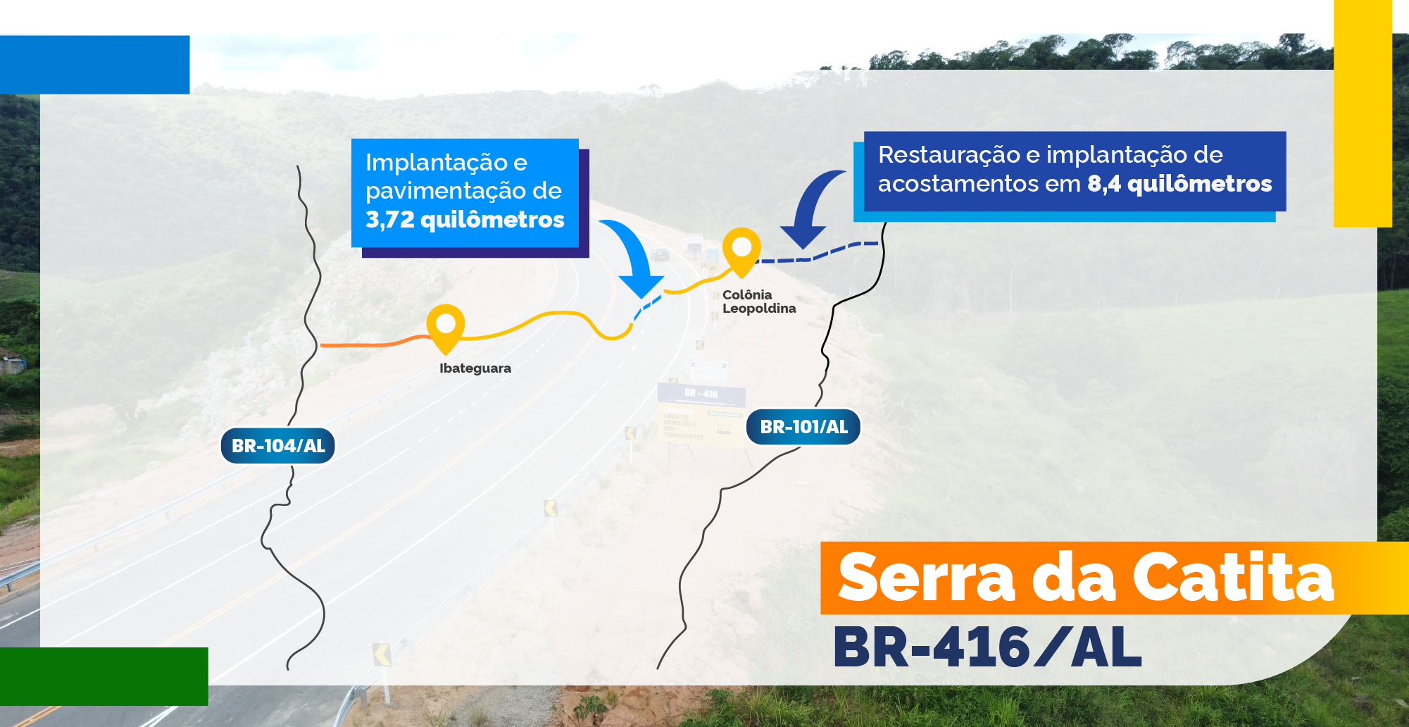 O Departamento Nacional de Infraestrutura de Transportes inaugurou nesta segunda-feira (17) o novo trecho pavimentado da Serra da Catita na BR-416/AL, em Ibateguara. Também foi entregue aos usuários a restauração e implantação de acostamentos em 8,4 quilômetros no trecho que liga a rodovia com a BR-101/AL, em Colônia Leopoldina. Com este conjunto de serviços, a autarquia garante uma melhora significativa na conectividade entre a BR-101/AL e a BR-104/AL. As obras tiveram um investimento aproximado de R$ 67 milhões do Governo Federal por meio do Novo PAC.