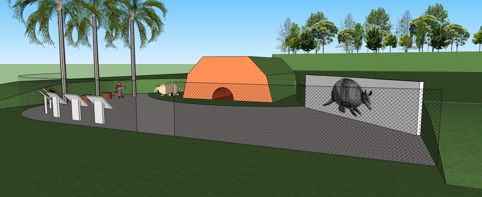 Os protagonistas desta descoberta foram reconstituídos em formato de escultura em tamanho real. A fêmea ancestral do atual tatu-mulita, de aproximadamente 1,30 metros de comprimento e 70 centímetros de altura, viveu nesta estrutura acompanhada de dois filhotes, de acordo com a característica da última câmara que remete a um berçário. Com a marca de pegadas de pata traseira e dianteira encontradas no interior, o paleontólogo e professor da Universidade Federal de Pelotas (UFPel), José Eduardo Dornelles, redesenhou a morfologia deste animal, o que serviu como base para a confecção em resina.