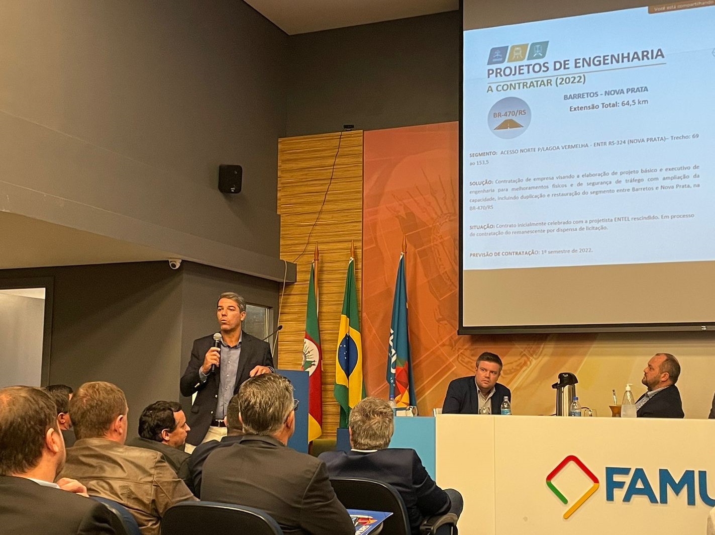 Além do diretor-geral do DNIT, participaram da assembleia extraordinária da Famurs o diretor de Planejamento e Pesquisa da Autarquia, Luiz Guilherme Rodrigues de Mello, e o superintendente regional do Departamento no RS, Hiratan Pinheiro. Mello explicou os estudos e projetos de engenharia em andamento e reforçou que é preciso dar continuidade às obras existentes para possibilitar o avanço de novos empreendimentos. Já o superintendente apresentou as metas a serem cumpridas com os recursos disponibilizados pelo governo estadual.